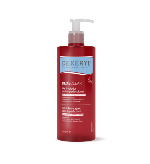 Nuestro nuevo DEXECLEAR Gel limpiafor anti-imperfecciones 2 en 1 para imperfecciones limpia profundamente la piel con tendencia acneica y reduce los granos. Su fórmula, con un 2 % de ácido salicílico, desincrusta los poros y reduce el exceso de sebo en un 90 % desde el primer uso*.