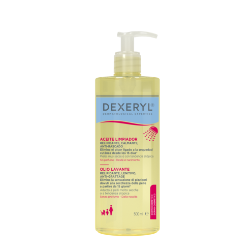 Dexeryl Aceite limpiador está diseñado especialmente para limpiar suavemente, calmar y relipidar las pieles secas, muy secas y con tendencia atópica, a la vez que protege la barrera cutánea. Eficaz desde el primer uso, elimina el 100 % del picor en 15 días¹, hidrata y repara la piel de toda la familia. Su fórmula sin perfume y sin jabón es adecuada desde el nacimiento. Su textura fluida es agradable de aplicar y crea una espuma suave y ligera en la piel, fácil de aclarar.