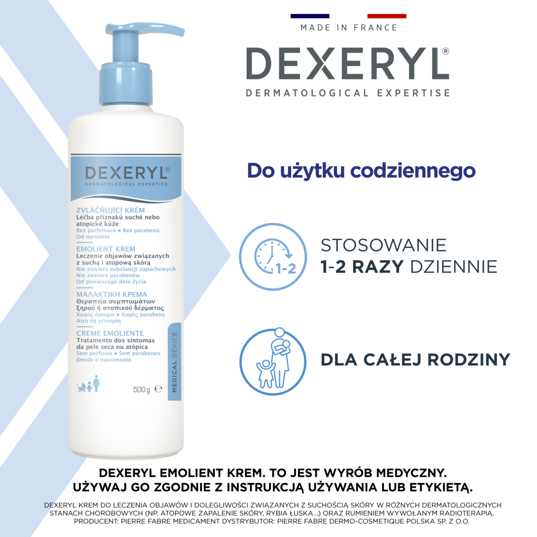 Przeznaczony do pielęgnacji skóry suchej lub atopowej krem emolient Dexeryl jest wyrobem medycznym odpowiednim do stosowania dla całej rodziny .Nawilża, odbudowuje barierę skórną i pomaga zapobiegać zmianom spowodowanym egzemą.